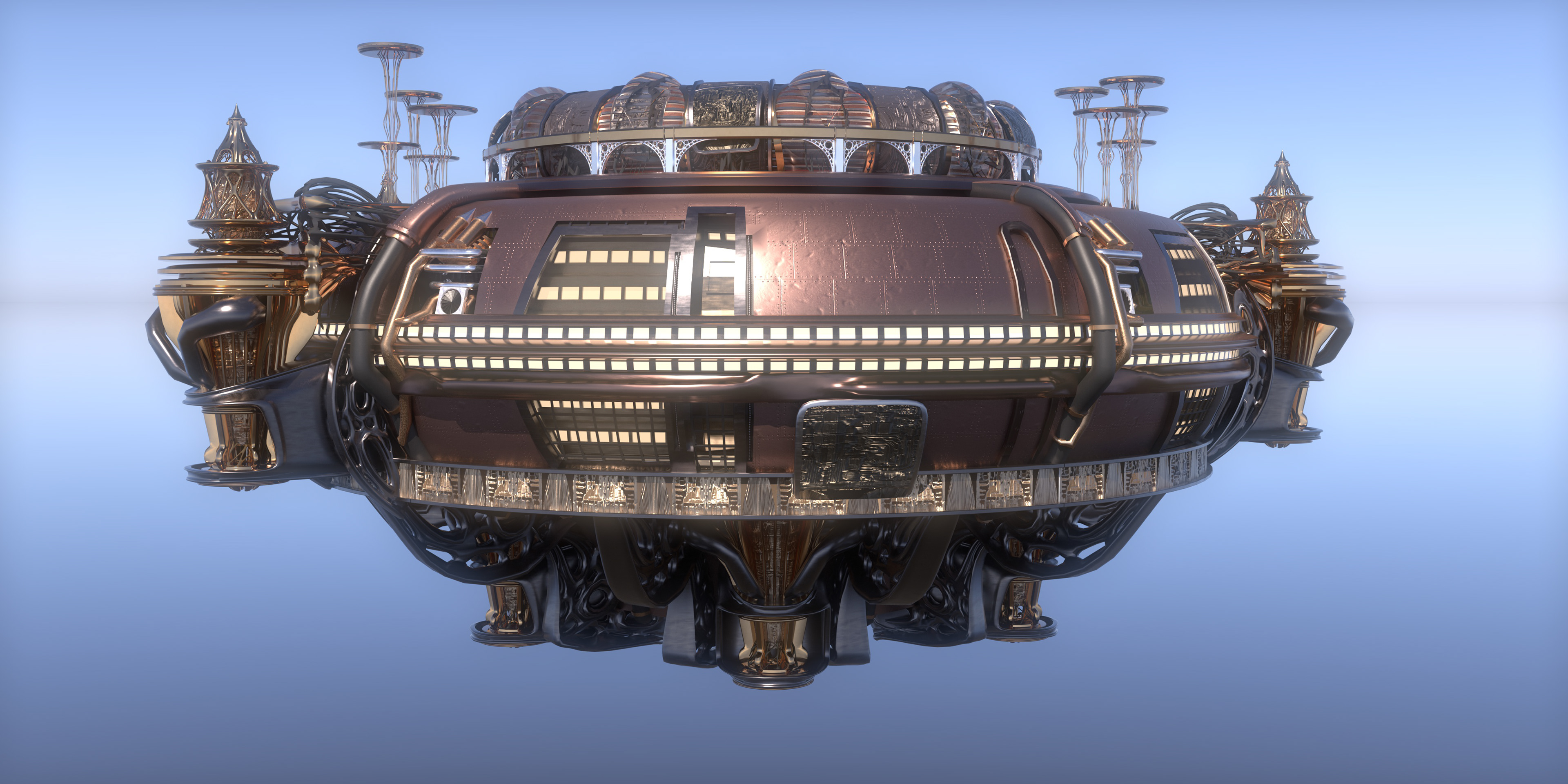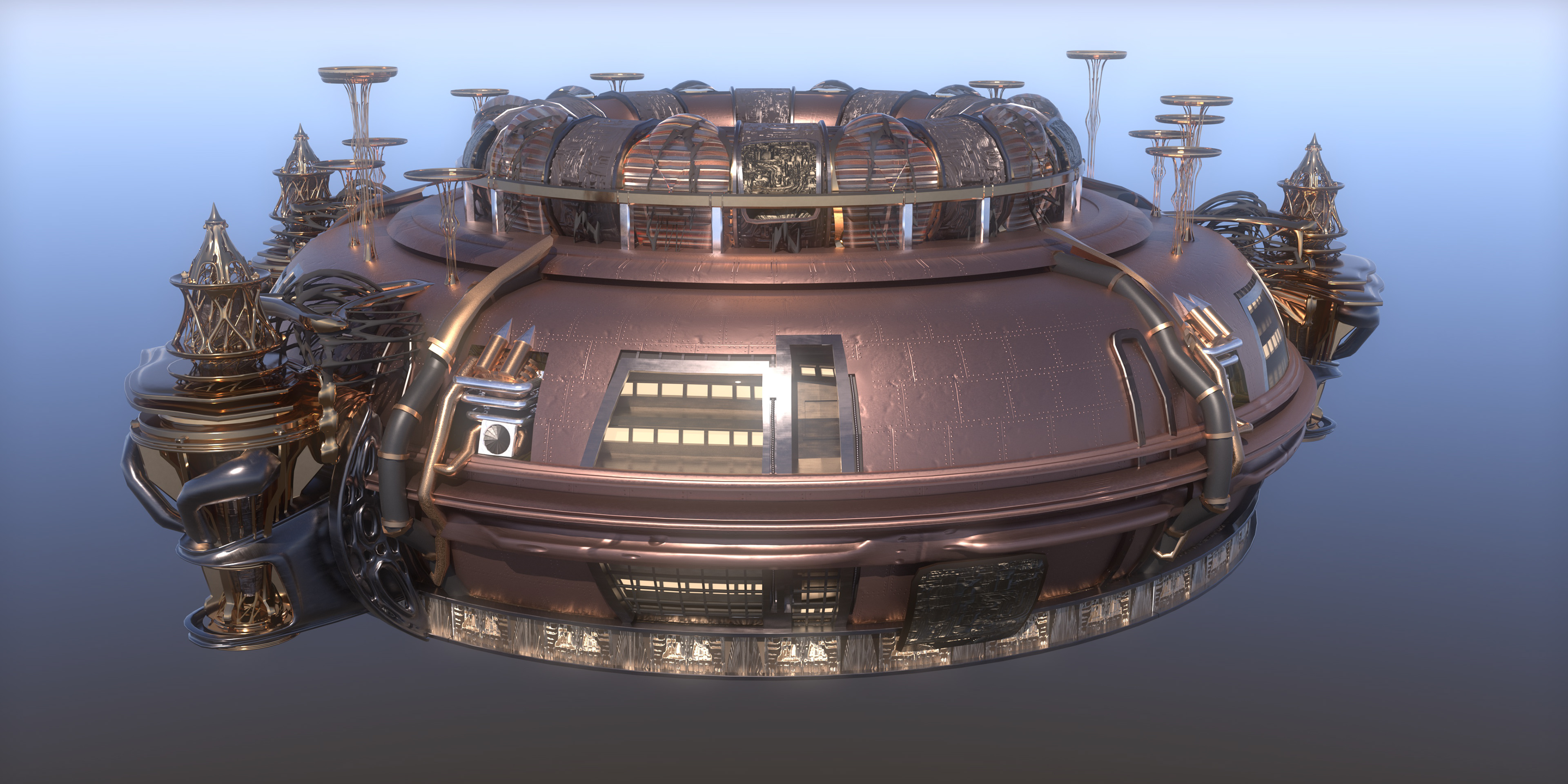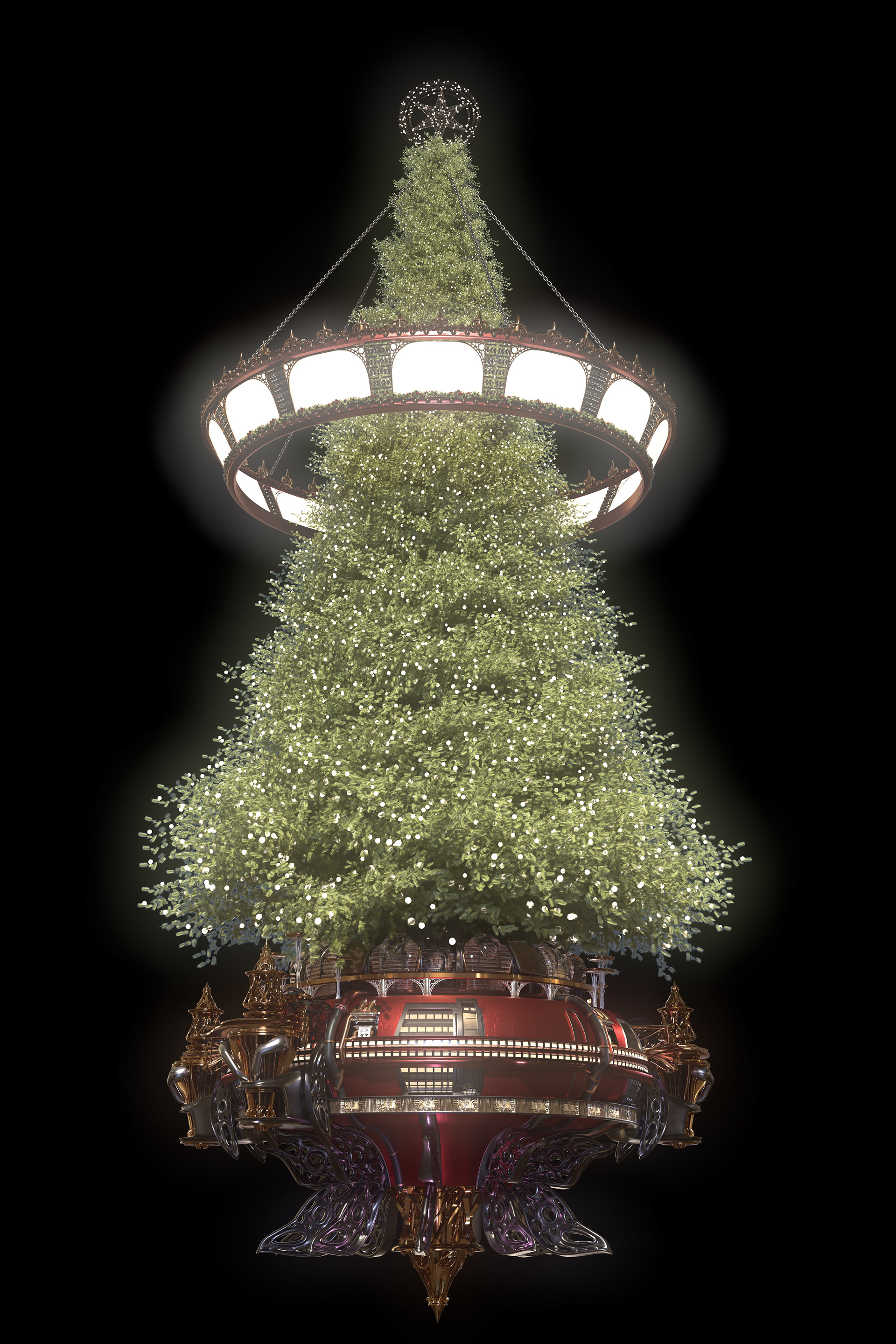 Hero Asset Steam Punk inspired floating Christmas tree for Christmas VR ride Modelled in cinema 4D using poly, procedural, volume and deformers to produce the final asset quickly rendered in Redshift.
